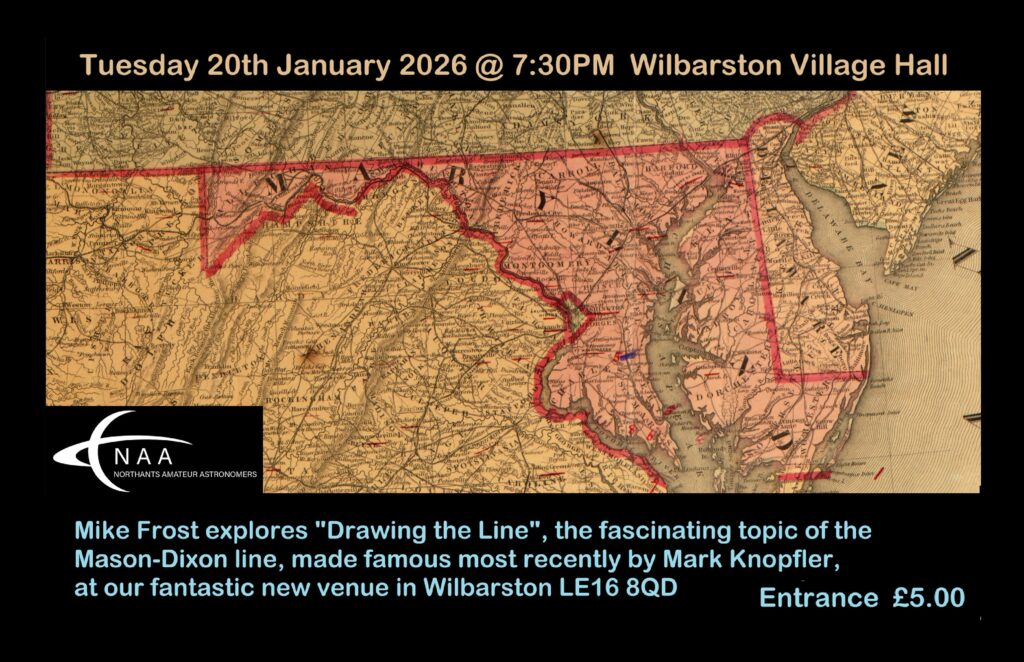 In addition, there will be monthly presentations taking place in the Main Hall. The first will be taking place on Tues 20th January at 7.30pm (cost of entry = £5). Mike Frost will be exploring the history behind the line that divided the “free” North from Dixieland, using astronomical observations to plot a straight line dividing Maryland from Pennsylvania.