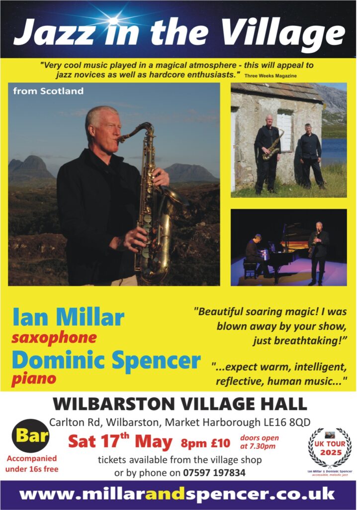 Ian Millar and Dominic Spencer will be performing at Wilbarston Village Hall on Sat 17th May at 8pm. They are unique in the UK Jazz community taking their blend of melodic jazz standards and original compositions to rural communities all over the UK. They use programmable lighting and table lights to create a wonderful intimate atmosphere for the music.